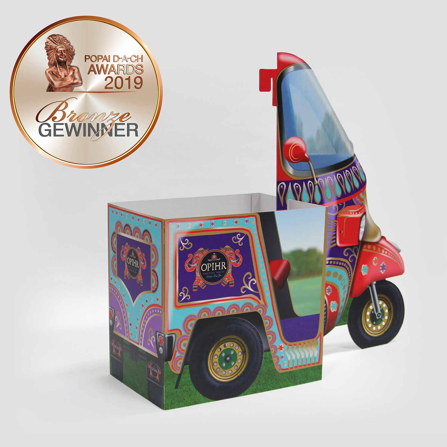 Effizientes Display „Opihr-Gin Tuk-Tuk“ gewinnt bronzenen POPAI Award